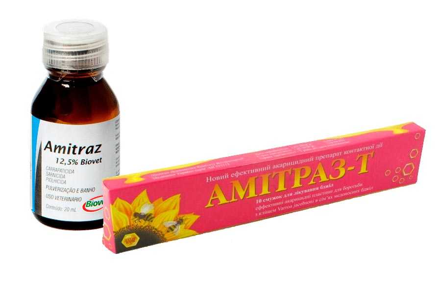 Амитраз – акарицид (от др.-греч. ἄκαρι — клещ и лат. caedo — убиваю) органическое соединение синтетического происхождения для борьбы с клещами. Умеренно токсичен (класс опасности 3), поэтому при работе с препаратами на основе амитраза следует соблюдать определенную технику безопасности. Для лечения пчёл используют разбавленный раствор амитраза. После обработки улья, первые клещи начинают опадать уже через пару-тройку часов. Вот список самых распространенных препаратов на основе амитраза, которые применяются для лечения варроатоза и акарапидоза пчел: