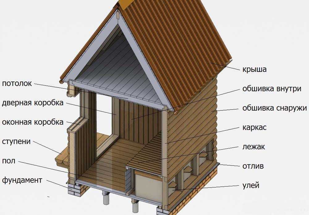 Строительство полноценного домика подразумевает полноценные стены, окна, дверь и крышу. Вариации строений различаются по размеру, количеству ульев и спальных мест.