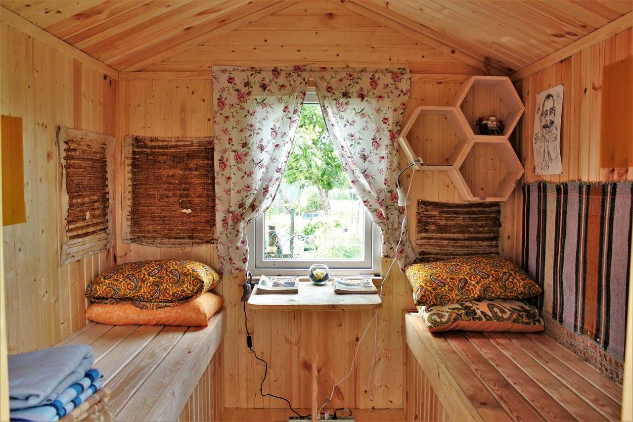 В пасмурную погоду комнатка нагревается пчелами, которые живут в 9 ульях. Такая конструкция пригодна для спокойного лечебного сна всей семьи.