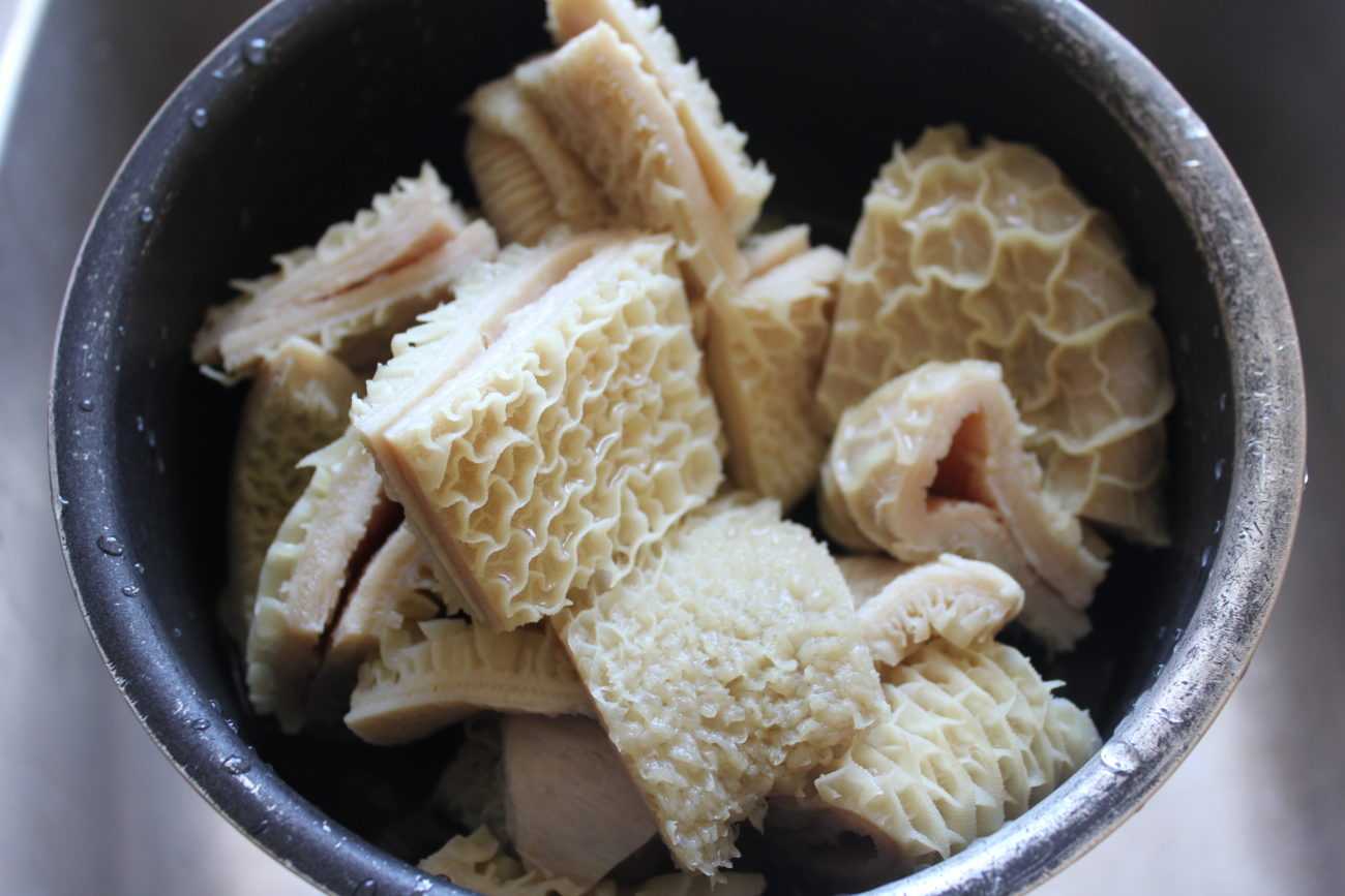 - Говяжью требуху почистить, погрузить в емкость с холодной водой. Оставить на 6 часов.