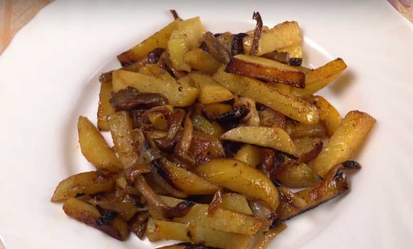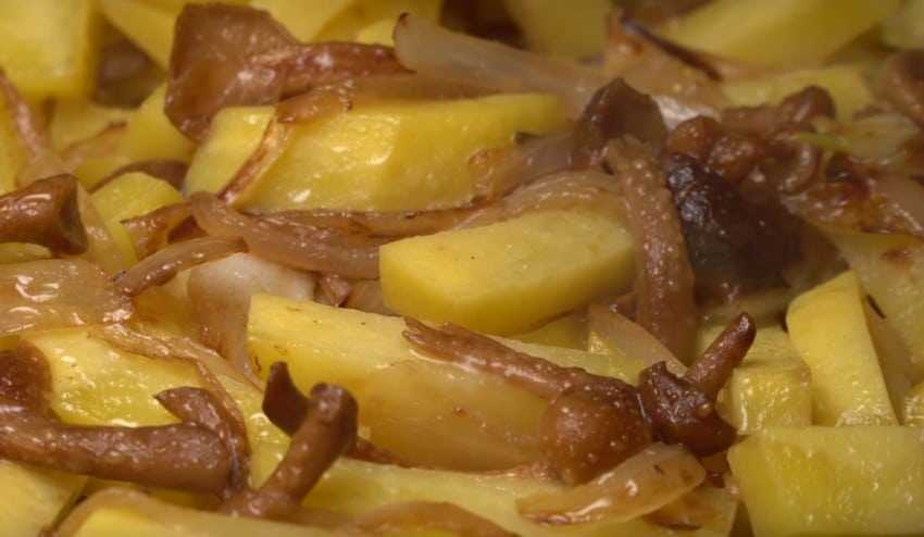 Рецепт жареной картошки с замороженными опятами и луком на сковороде
