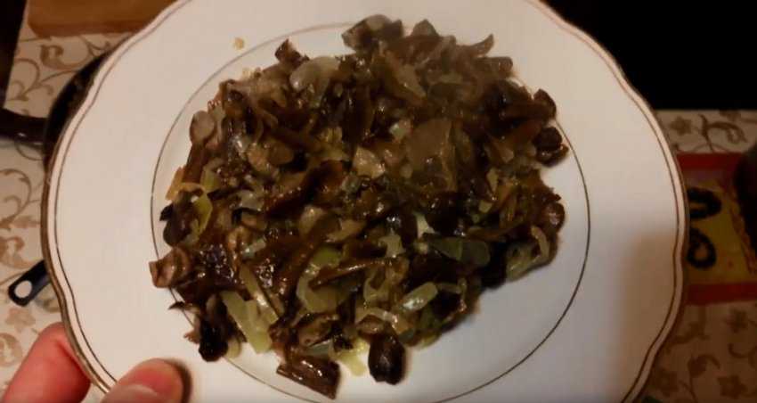 Жарят и сушеные грибы с луком. Их промывают, заливают теплой водой на 5-7 минут, а затем отправляют на сковороду к луку. После непродолжительной жарки добавляют жидкость, оставшуюся после замачивания опят, и тушат до готовности.