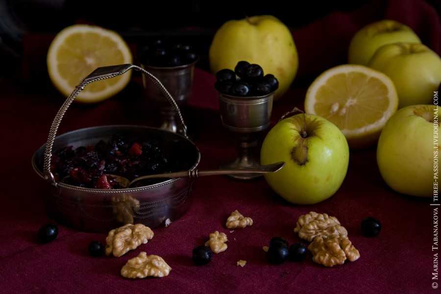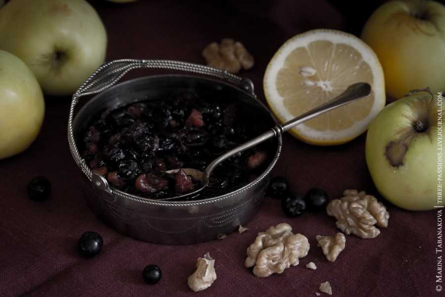 Очень необычное варенье с ярким и интересным вкусом. Купить все ингредиенты на рынке сейчас совсем не проблема, они не дорогие и не экзотичные. Зато результат получается очень впечатляющим. Яблоки брать лучше “антоновку”, она наиболее гармонично сочетается с черноплодной рябиной и не разваривается в кашу, как более мягкие сорта. Количество лимонов и орехов можно варьировать, в этот раз я положила их больше, чем по классической пропорции. Как раз появились грецкие орехи нового урожая, с ними будет еще вкуснее. Отправляю на “Ореховый” ФМ к Соне.