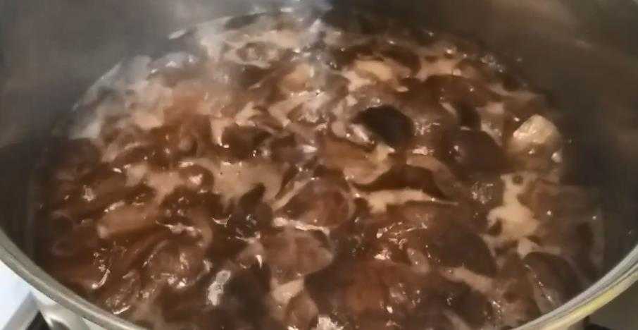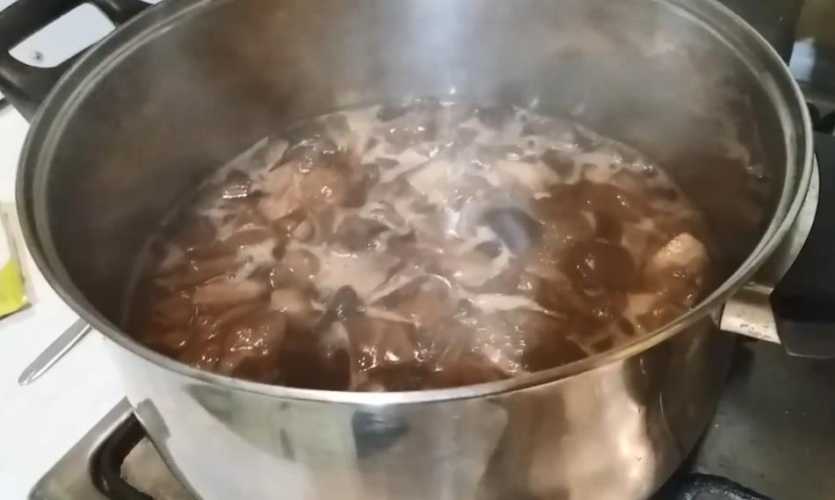 Грибы тщательно промыть, отрезать загрязненные участки на ножке. Сложить в кастрюлю и проварить в кипящей воде в течение 25 минут.