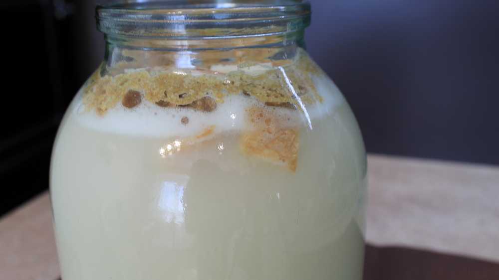 Прошло около 15-16 часов и через прозрачные стенки банки можно увидеть активный процесс брожения в квасе.