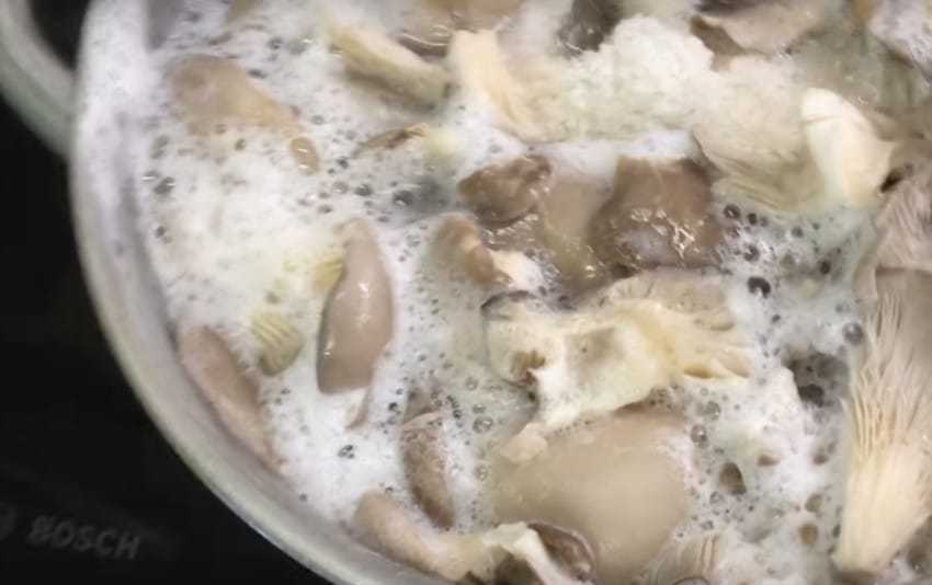 - Грибы после предварительной подготовки отвариваем в воде 25-30 мин, снимая с поверхности пенку.