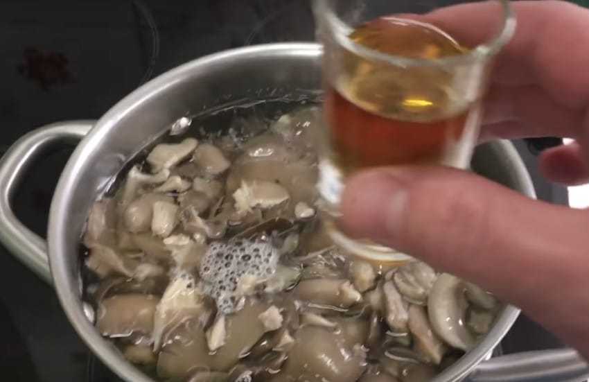 - Поместить грибы в кипящий рассол и проварить их на медленном огне, помешивая, 10-15 минут. За 2-3 минуты до окончания варки влить уксус.