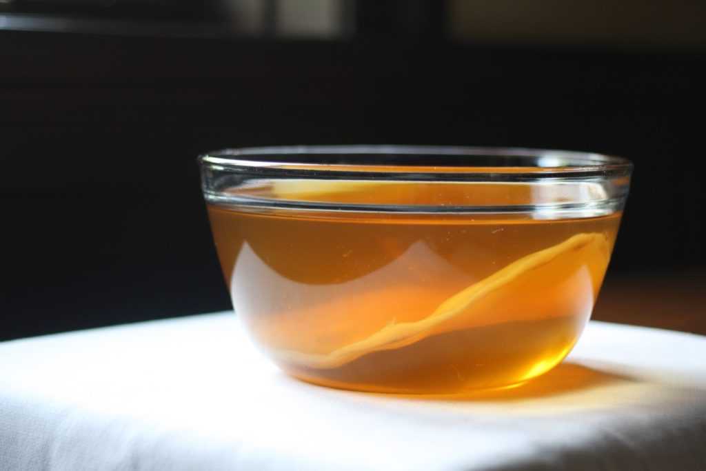Через 5-7 дней откройте марлю, на поверхности напитка должна быть тонкая пленка, которая говорит о том, что гриб успешно зародился. Тогда же появится сильно выраженный запах уксуса, но переживать не стоит – он еще раз подтверждает успешное развитие грибного тела. Более того, запах быстро исчезнет.