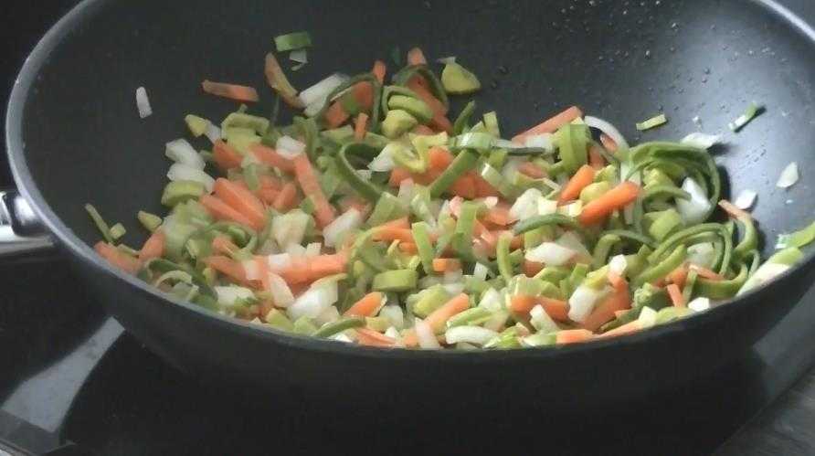Морковку нашинковать тонкой соломкой, а луковицу – мелкими кубиками. Грибы и порей нарезать на 4 части, длинные стручки фасоли на 3 части поперек.