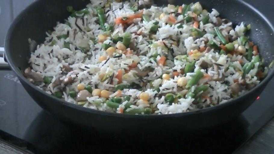 Рис с шампиньонами и овощами на сковороде