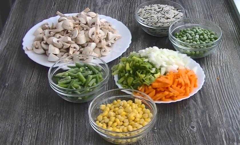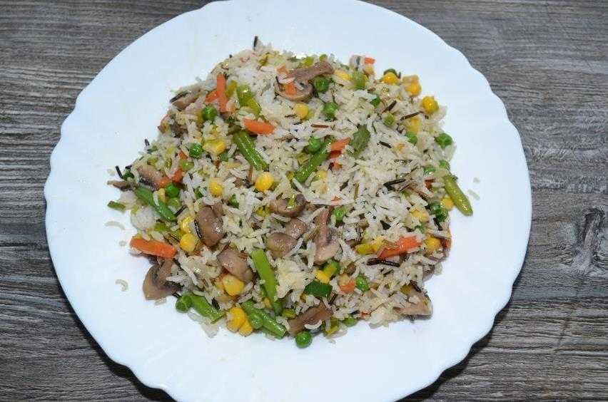 Смешать поджарку в сковородке с грибами, кукурузой и бобовыми. Протушить овощную массу в течение 6 минут. Добавить отварной рис, перемешать и подержать на огне 2-3 минуты.