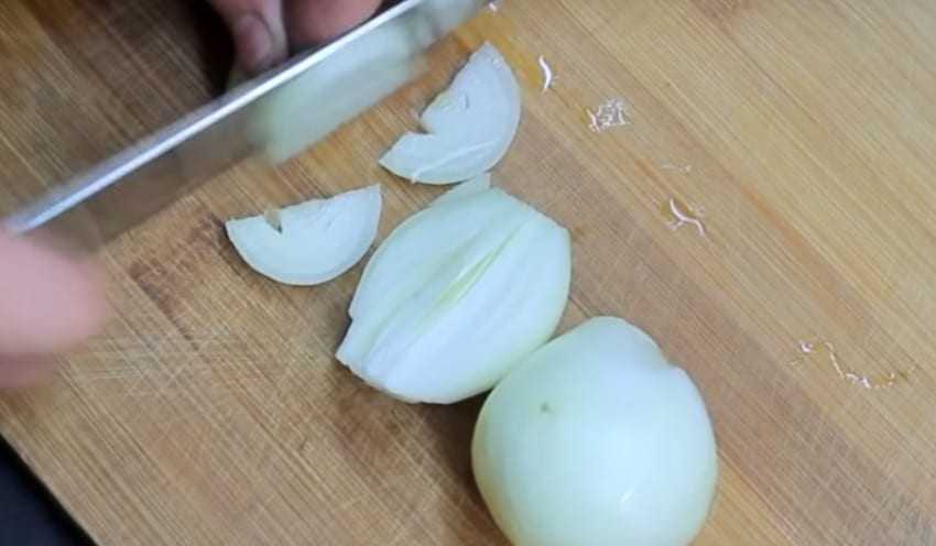 Подготовим лук и чеснок. Овощи почистим, порежем. Лук — полукольцами, а чеснок на половинки.