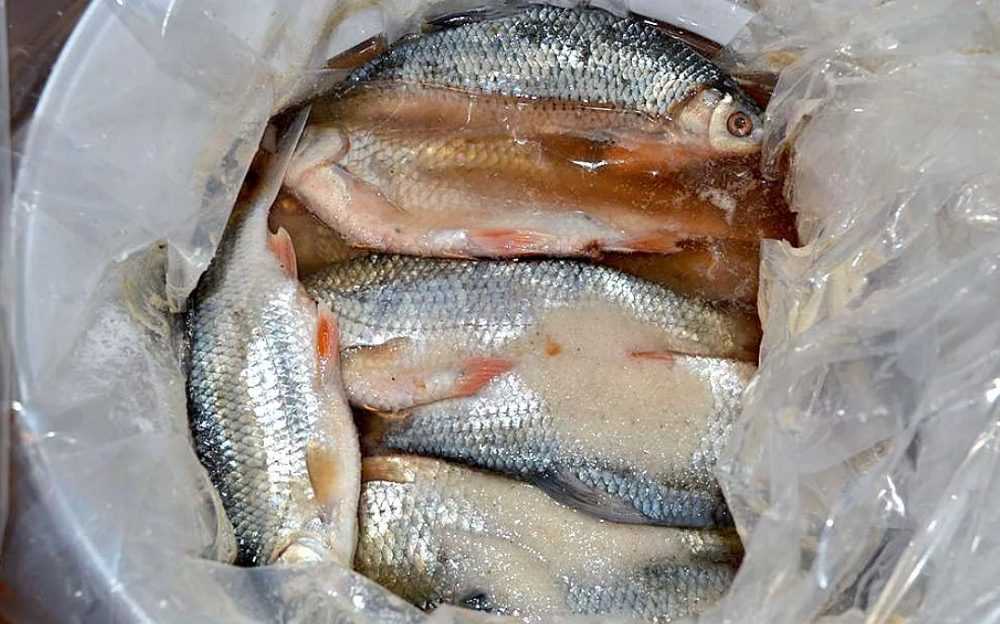 - Сухой метод посола считается традиционным: в процессе не используют дополнительные пряности. Подготовленные тушки натереть крупными фракциями соли по хребту, заложить в брюхо, под жаберные крышки и в отверстия, прорезанные на шкурке. Язей сложить в миску, засыпать солью, перемешанной с перцем свежего помола. Крупных экземпляров весом от 2 до 3 кг солить около 14 часов, а для рыбёшек массой от 0,3 по 0,9 кг достаточно 5-6 ч. Если язей сложить в 2-3 слоя, нужно поместить сверху гнет, чтобы мякоть полностью пропиталась солью.