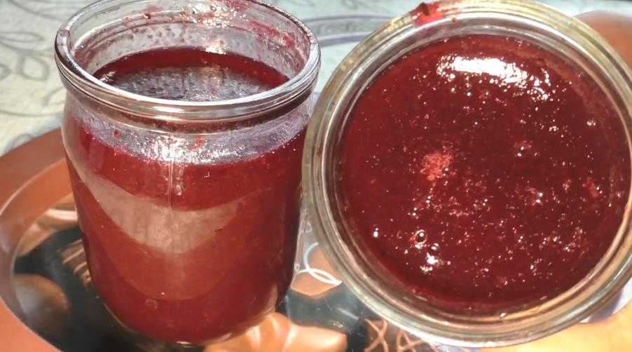 Ягоды ставят на медленный огонь и пропаривают в течение 10 минут. Потом их разминают и через сито тщательно протирают. В отличие от прошлого рецепта, в этом случае требуется немного меньше сахара, в пропорции 1:1. После этого ягоды варят как обыкновенное варенье, сначала используя сильный огонь, а после образования пленки и ее снятия – медленный, пока жидкость не уменьшится наполовину. Получившееся по этому рецепту желе хранят около года.