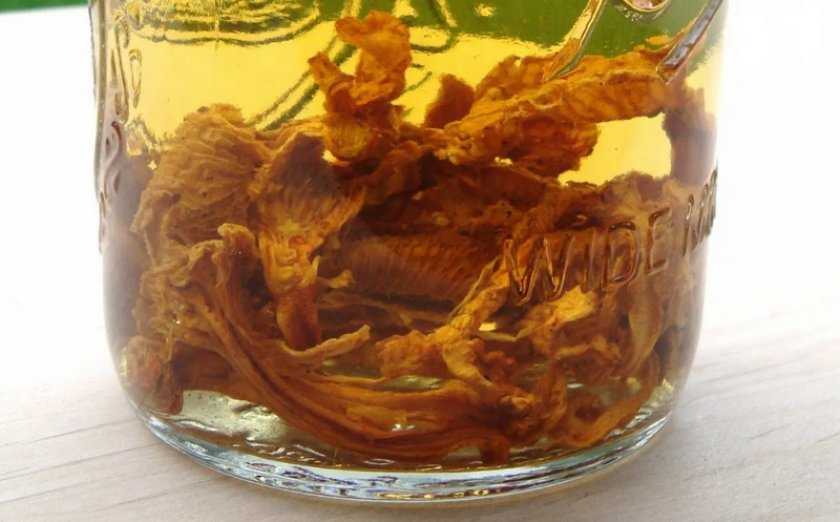 Вместо свежего сырья допустимо использовать сушеные грибочки. На 0,75 литра алкоголя понадобится 45 грамм сухих лисичек.