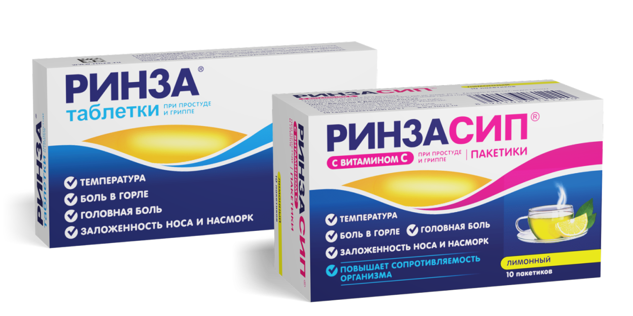 РИНЗА в таблетках для приема внутрь разрешен к применению с 15 лет9. Кроме парацетамола, в состав препарата входят кофеин, фенилэфрина гидрохлорид и хлорфенамина малеат9.