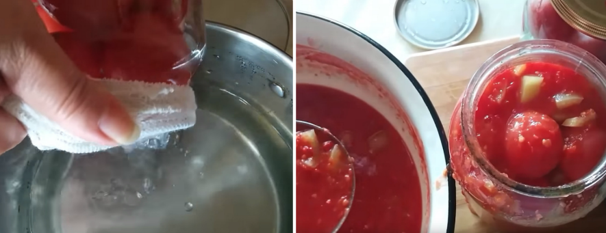 Вот они, слитые баночки с прогретыми томатами. Не медлим и в каждую по горлышко добавляем сок — прямо с плиты. Половник предварительно стерилизуем, залив кипятком на 3-5 минут.
