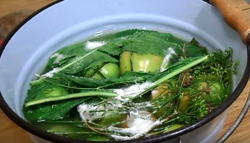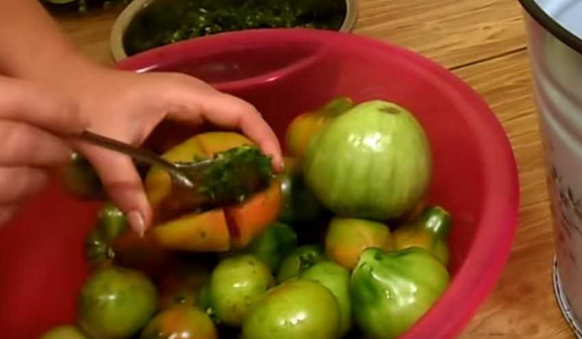 Засолка зеленых помидор холодным способом — фаршированные чесноком в ведре