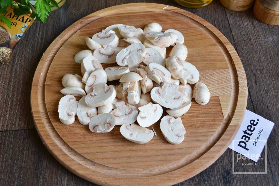Затем шампиньоны нужно нарезать на довольно крупные дольки.