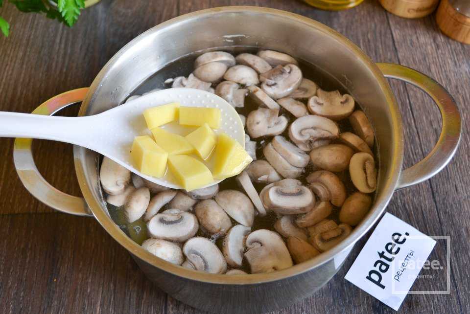 Когда вода закипит, заложите грибы. Дайте супу закипеть, варите при медленном кипении 20 минут.