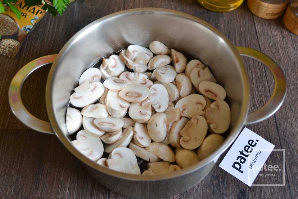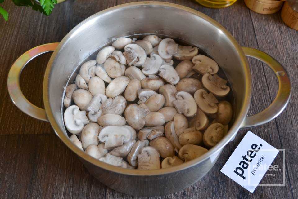 Нарезанные шампиньоны нужно проварить в воде до кипения, 5-10 минут.