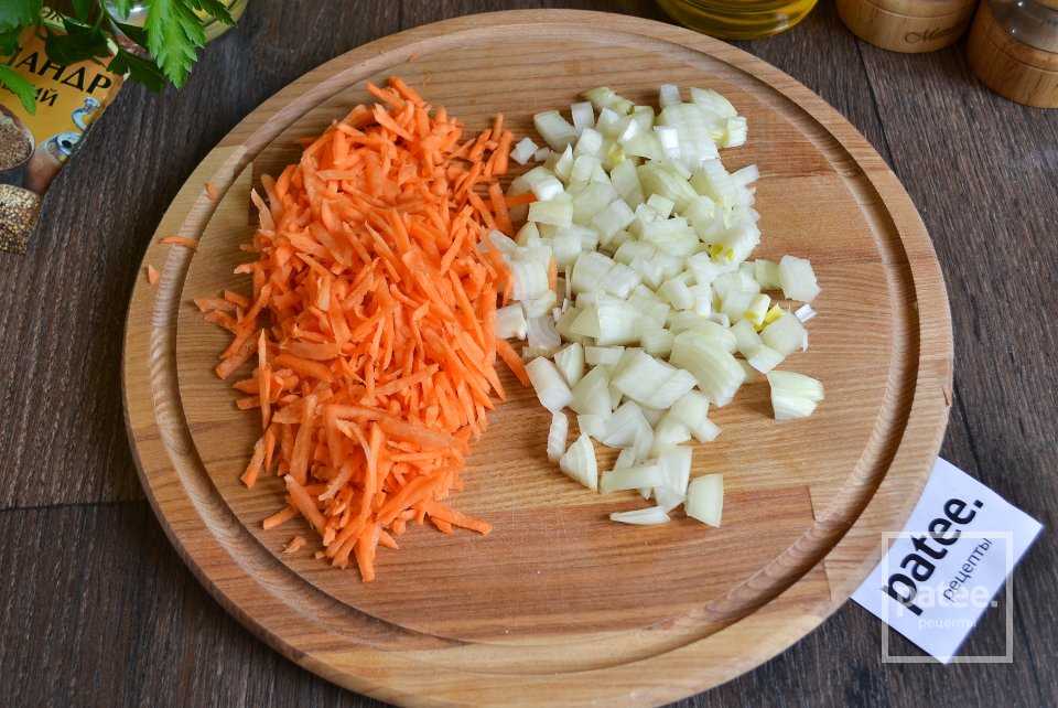 Репчатый лук накрошить мелким кубиком. Морковь, вымыть, очистить и натереть на терке.