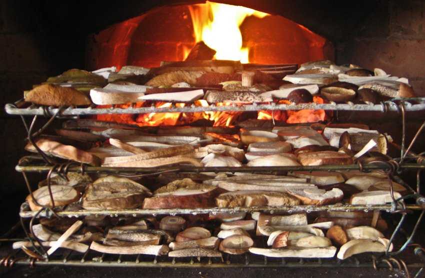 Если у кого-то на даче либо в сельской местности сохранилась обычная дровяная или угольная печь, то можно высушить грибы в ней. Для этого следует поместить продукт на поддоны и поставить их в тёплую печку.