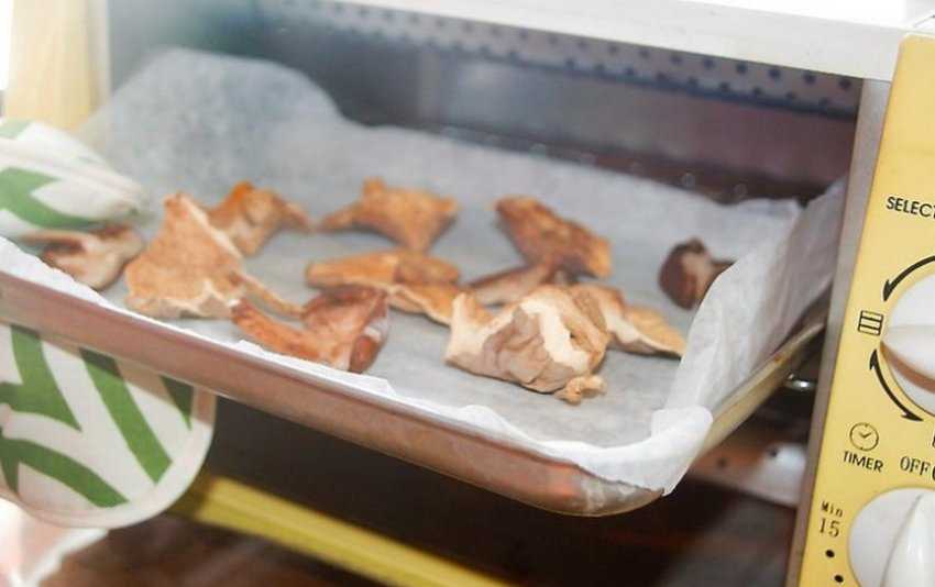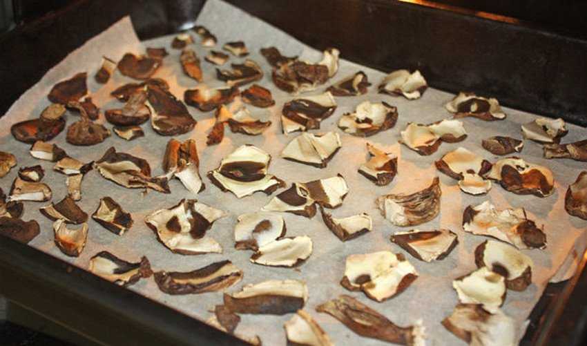 При таком методе нужно контролировать, чтобы температура была не слишком высокой. Если слышится шипение, а выделяющаяся из грибов влага кипит, то необходимо вынуть поддоны и дождаться, пока печь остынет. Осуществлять сушку таким образом необходимо на протяжении четырёх-пяти дней.