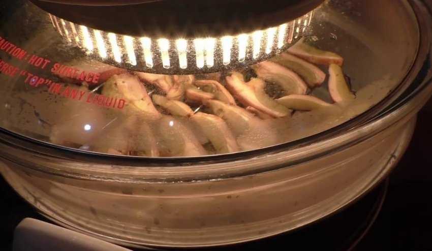 Если у хозяйки нет специальной электросушилки для овощей и фруктов, можно воспользоваться обычной микроволновой печью. В ней температура выставляется на 100°C, и начальное время сушки грибов занимает всего 20 мин. Затем нужно открыть дверцу, чтобы лишняя влага испарилась (примерно 10-15 мин), и продолжить сушить в микроволновке при той же температуре ещё 20 мин.