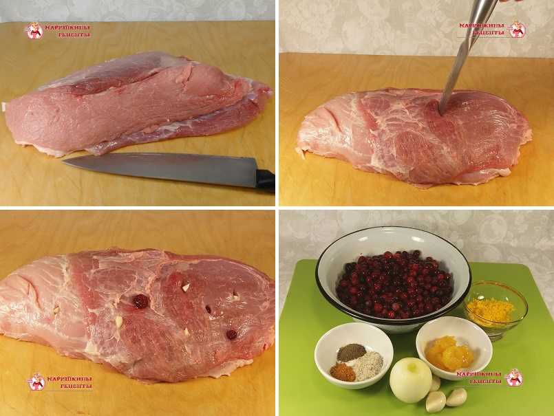 Кусок свинины нужно тщательно промыть в холодной воде и обсушить потом бумажным полотенцем, чтобы удалить лишнюю влагу. Срежьте с нее все пленки и лишний жир. Далее необходимо острым ножом сделать надрезы в куске свинины и заложить в них клюкву и чеснок, чередуя в шахматном порядке.