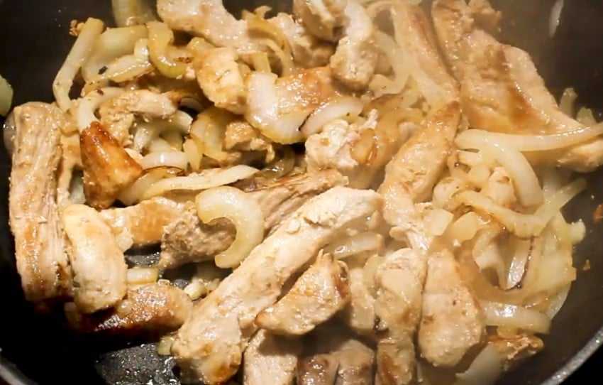 - Подготовленный лук соединяют с белыми грибами и обжаривают на сильном огне около 5 минут, накрывают сковороду крышкой и тушат 10 минут.