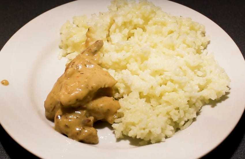 Соус, приготовленный с грибами, сметаной и курицей, прекрасно подчеркнёт вкус отварного риса. Такое сытное блюдо обязательно понравится вашим мужчинам.