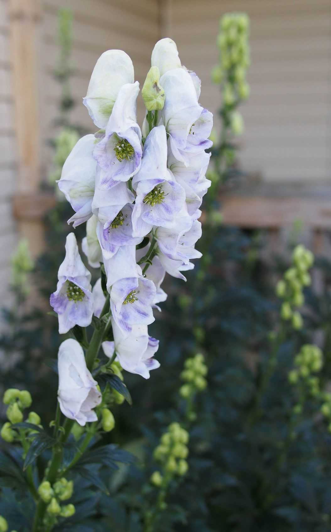 Ближе к голубому цвету бутоны еще одного гиганта – аконита лобеливидного. У него есть двухцветный подвид. Большая часть бутона белая. Голубой – лишь окантовка. Подобную расцветку имеет пестрый аконит. Уход за ним в радость, ведь бутоны не сходят с растения в течение всего лета.