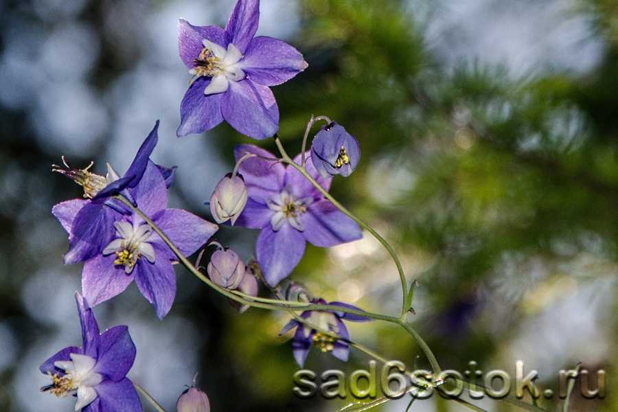 Родом с Кавказа, из Ирана и Малой Азии, 30-60 см в высоту, густо опушенный стебель, крупные, до 10 см в диаметре, светло-голубые цветки с длинными шпорцами. Цветет с середины мая до середины июня;