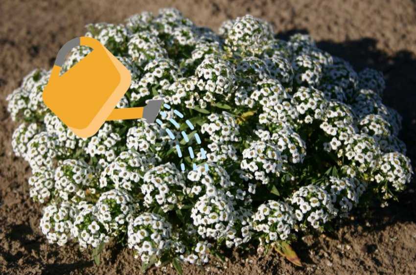 Алиссум довольно неприхотлив в своём уходе. Растение засухоустойчиво, однако во время цветения требуется систематический полив. Если нет никаких осадков, то нужно поливать один-два раза в 7 дней, чтобы почва просыхала на 30-40 миллиметров.