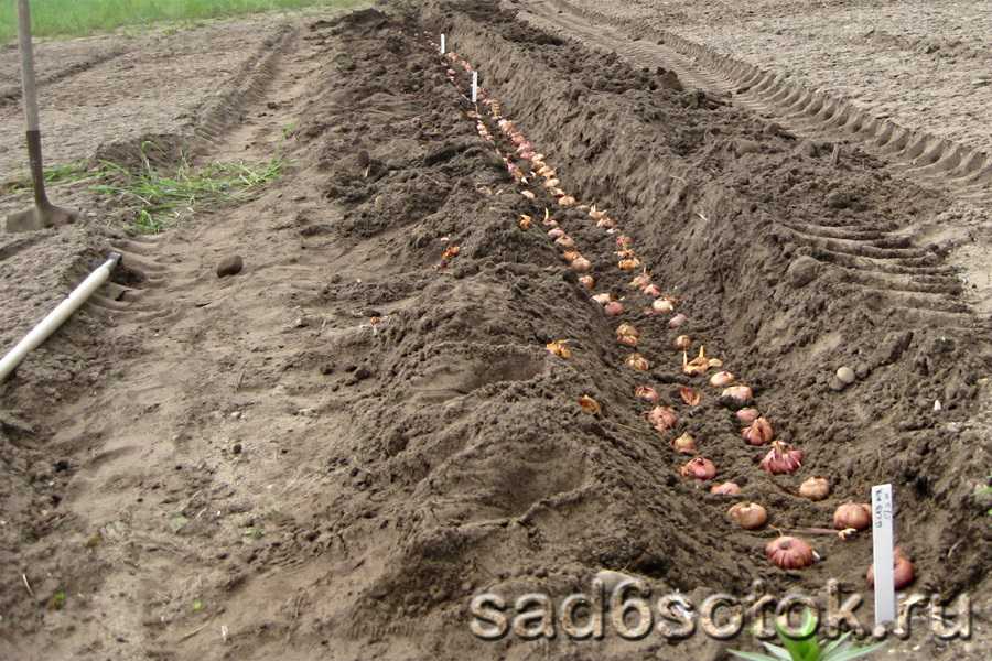 Дно лунок или канавок разравнивают, насыпают слой песка в 3–5 см и поливают. Луковицы высаживают на глубину, равную трем диаметрам. Для крупных луковиц оптимальная глубина посадки – 15 см, мелкие заглубляют на 8–10 см. Расстояние между луковицами при посадке крупноцветковых гладиолусов – 15–20 см, остальные высаживают через 10 см. Такая схема размещения защитит луковицы от заморозков и ветра.
