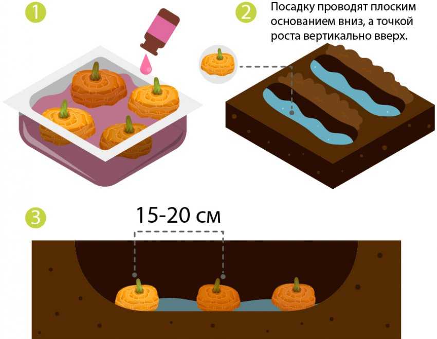В мае, когда земля достаточно прогреется, можно высаживать в землю клубнелуковицы на глубину от 7 до 10 см, при этом клубнелуковицы должны находится друг от друга на расстоянии примерно 11-12 см. Наиболее благоприятно для семян, если почва будет подготовлена заранее в сентябре-октябре и будет удобрена.