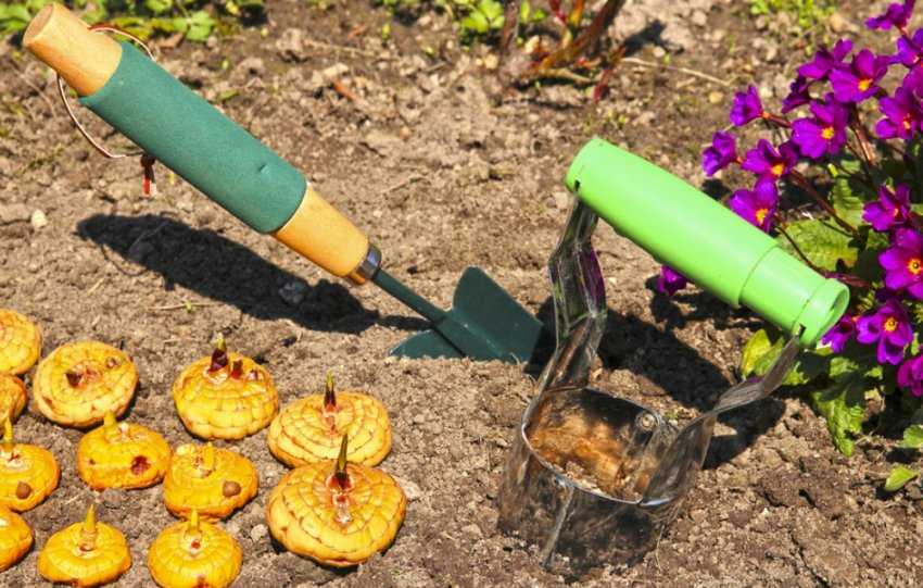 - Ямки необходимо увлажнить и присыпать песком, который убережет корни луковицы.