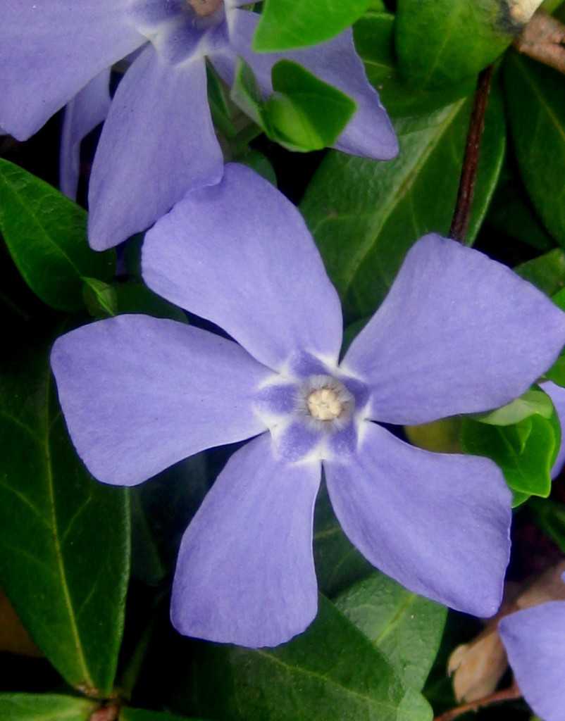Барвинок большой – Vinca major – самый крупнолистный (до 8 см) и довольно высокий(около 25 см). Два раза в год, весной и осенью, расцветает синими соцветиями.