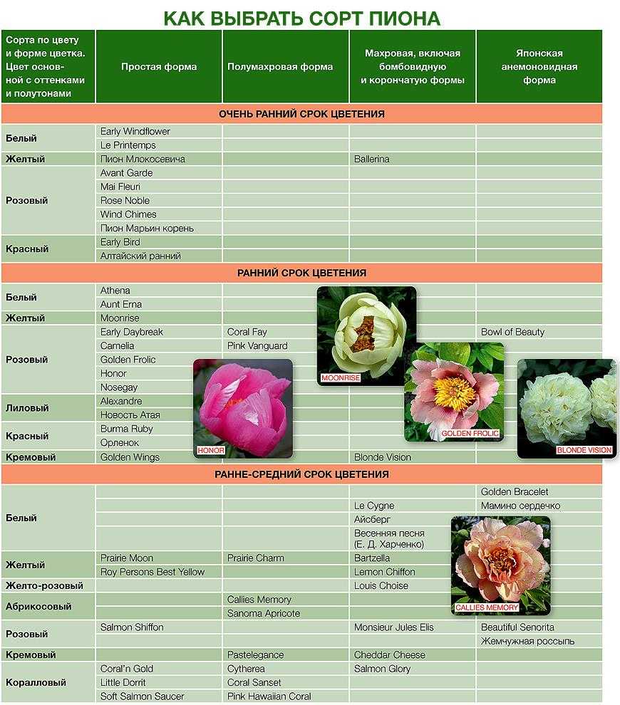 В таблице представлены более 200 сортов пионов из разных групп для длительного цветения в саду и увеличения