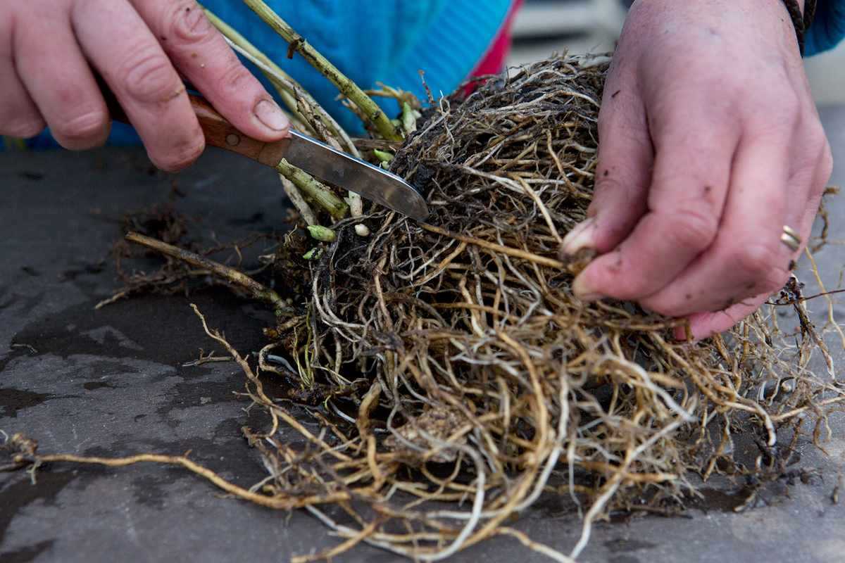 Саженец осторожно выкапывают, освобождают от остатков земли и разрезают на фрагменты. Высаживают в почву в тот же день, чтобы корешки не пересохли