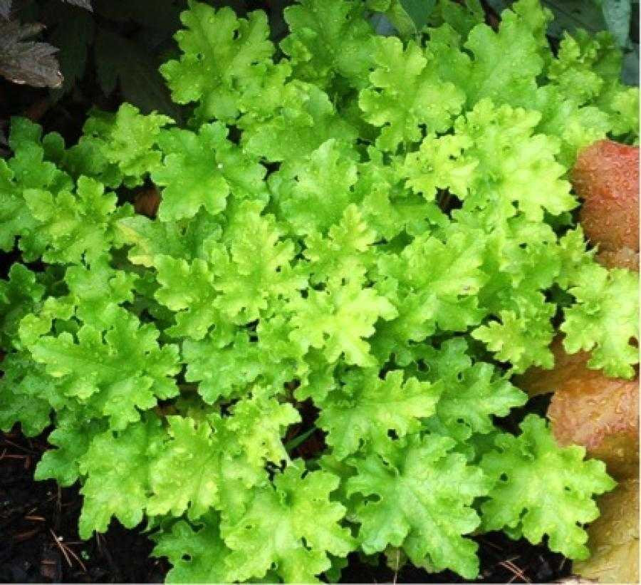 «Гейхера Лайм Мармелад» (Heuchera Lime Marmalade) – шикарный многолетник с красивой формой листьев и резными краями. Данный вид отличается сочной, лимонно-салатовой расцветкой листвы. Высота кустарника достигает полуметра, а ширина 30 см. К лету расцветка кустарника становится золотистого оттенка. Цветение в виде розетки с белыми мелкими цветочками начинается в мае и длится до июня.