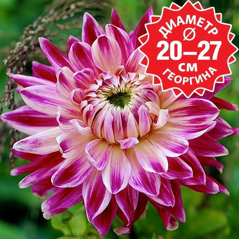 Георгина декоративная макси Vancouver (Ванкувер) крупноцветковый сорт. Высокие прочные стебли украшают махровые цветы, поистине гигантского диаметра. Насыщенный малиновый цвет лепестков постепенно переходит на кончиках в кремовый. Является великолепным украшением любого сада. Цветет продолжительно с июля по сентябрь. Для более обильного цветения удаляют боковые бутоны. Идеально подходит для посадки как в одиночных, так и в групповых композициях. Высаживают георгины на хорошо освещенных, защищенных от ветра местах. Предпочитают легкую, плодородную землю. Уход заключается в обильном поливе и прополке. Размножение происходит путем деления клубней. На зиму клубни выкапывают, просушивают и хранят в сухом прохладном месте.