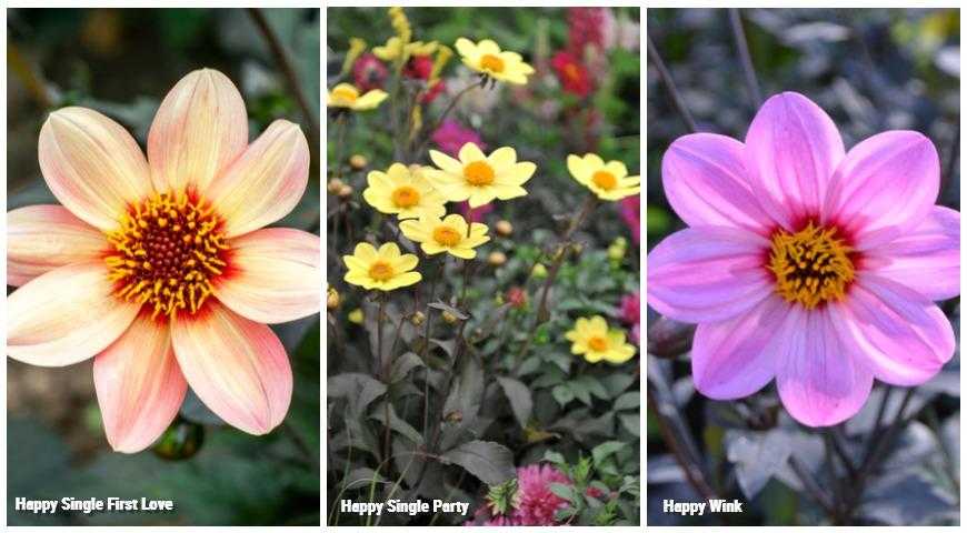 Георгины представляют собой махровые соцветия круглой, иногда слегка приплюснутой формы, шириной от 8 до 15 см и высотой от 90 до 120 см: красного цвета Doreen Hayes, желтый Esmonde и красно-персиковый Crichton Honey.