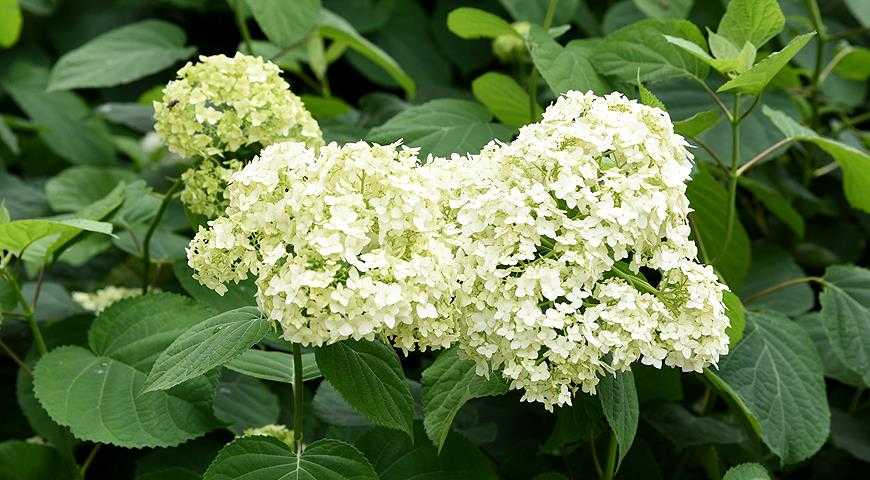 «Аннабель». Белые либо кремовые цветки собраны в шаровидные соцветия, диаметр которых достигает 20 см. Как правило, высота древовидной гортензии не превышает 1,5 м, хотя в объеме довольно быстро добирает до 3 м. В период цветения, длящийся с июня по сентябрь, стебли растения постепенно склоняются к земле, не выдерживая тяжести цветков