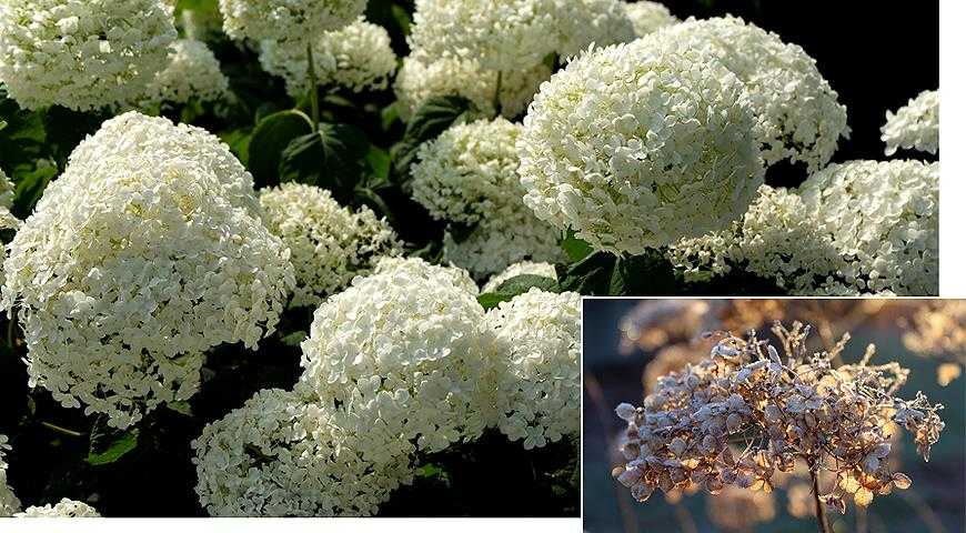 на фото гортензия древовидная сорт Annabelle (1 – летом и 2 – осенью)