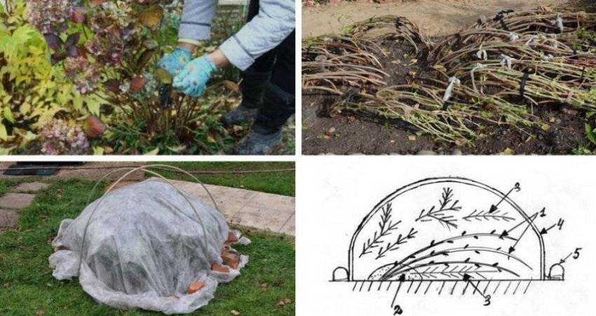 Сам куст тоже укрывается. Для этого можно собрать все ветки в пучок и обернуть мешковиной (агроволокном, брезентом, ветошью). Для защиты от ветра концы укрывного материала рекомендуется закрепить камнями, кирпичом, пришпилить к земле прутиком.