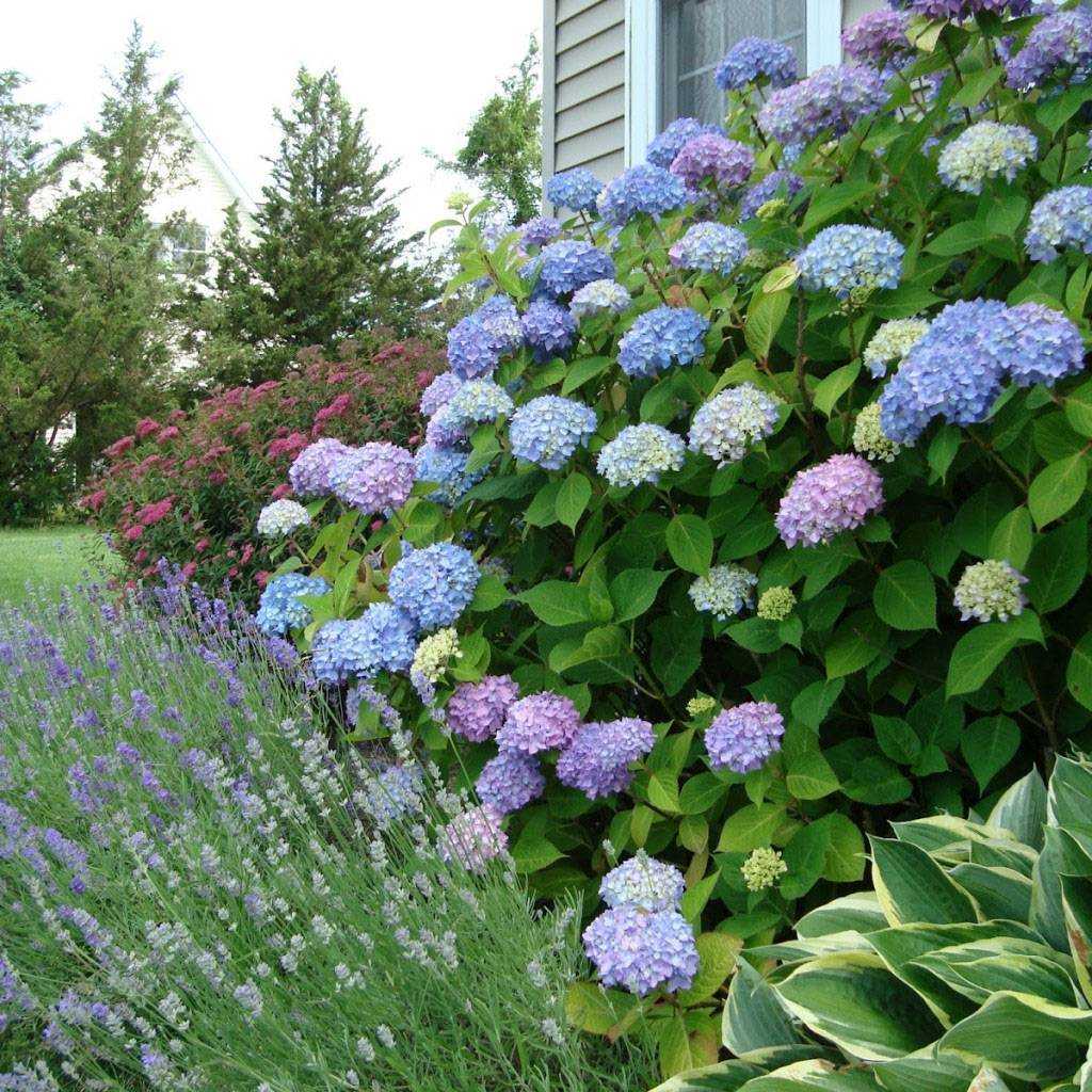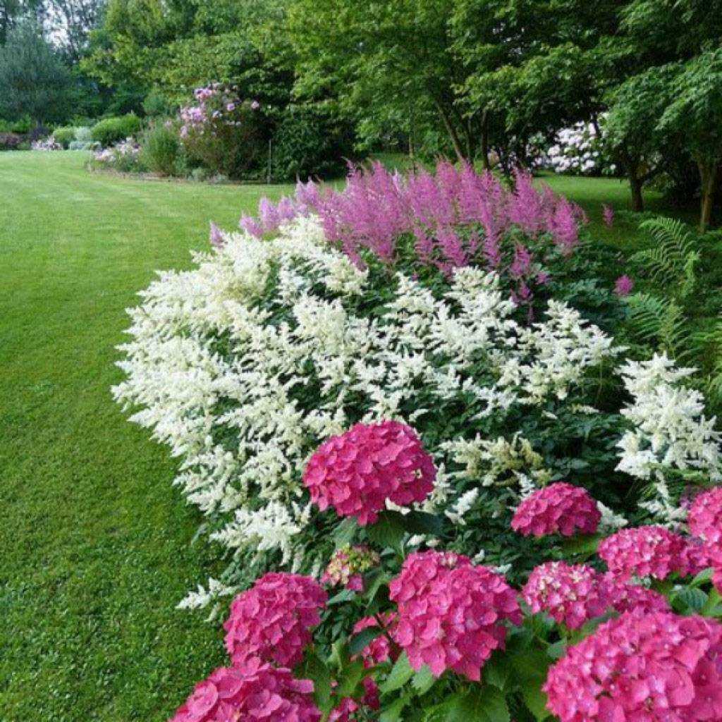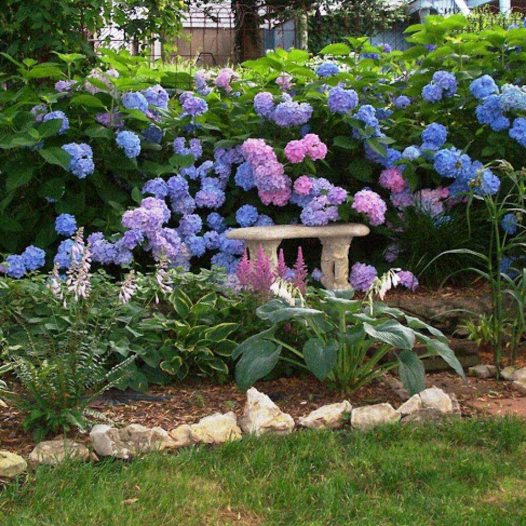 Чудесно выглядит гортензия в окружении многолетних цветов и папоротников
