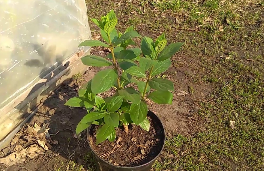 После этого на 2/3 материал погружают в грунт. Состав грунта для черенков гортензии должен содержать песок и торф в равных пропорциях. Наземную часть прикрывают полиэтиленом или же обрезком пластиковой бутылки. Требуется обеспечить парниковый эффект. В таком положении должно происходить укоренение черенков. Условия для укоренения должны обеспечивать влажность и прохладу. Когда на рассадном материале появится листва, все черенки могут быть высажены в открытый грунт.