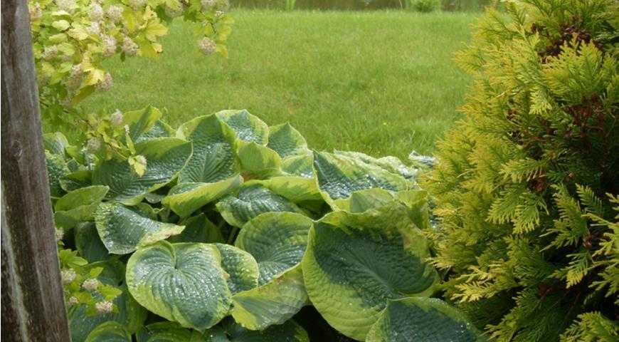 Впрочем, даже солнцевыносливые хосты рекомендуется защищать от палящих лучей полуденного солнца, поэтому не стоит высаживать их на открытом участке. Оптимальное решение — составить композицию таким образом, чтобы компаньонами хост были кустарники или высокие многолетники, которые прикроют их от жаркого солнца в разгар дня. Удачными партнерами могут стать спиреи, парковые розы, клопогоны, посконники, пионы, другие садовые растения.
